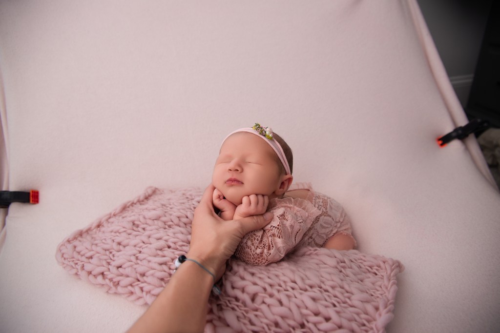 When you see a beautifully posed newborn photo—like this sweet little girl all curled up with her chin propped in her tiny hands, it may look effortless. But the truth behind the magic? It’s all about safety first, always.