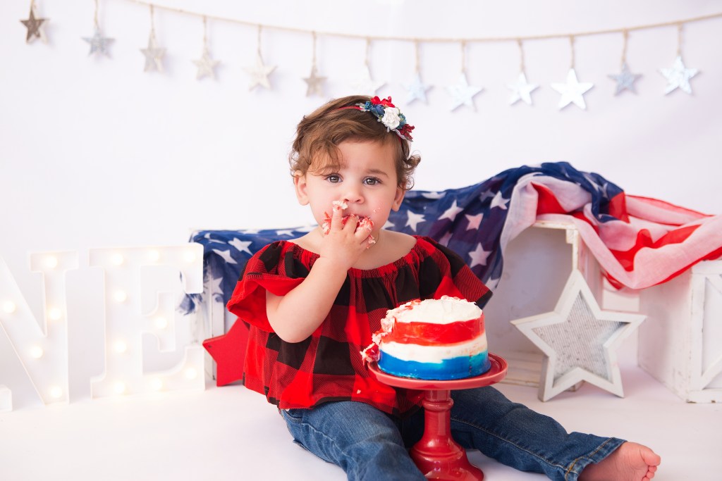 Her festive backdrop was filled with bright Americana vibes—think bold stars, rustic crates, glowing marquee letters, and a perfectly patriotic cake with all the colors of the flag. The second that tiny hand dipped into that red, white, and blue frosting, we knew we were in for something magical.