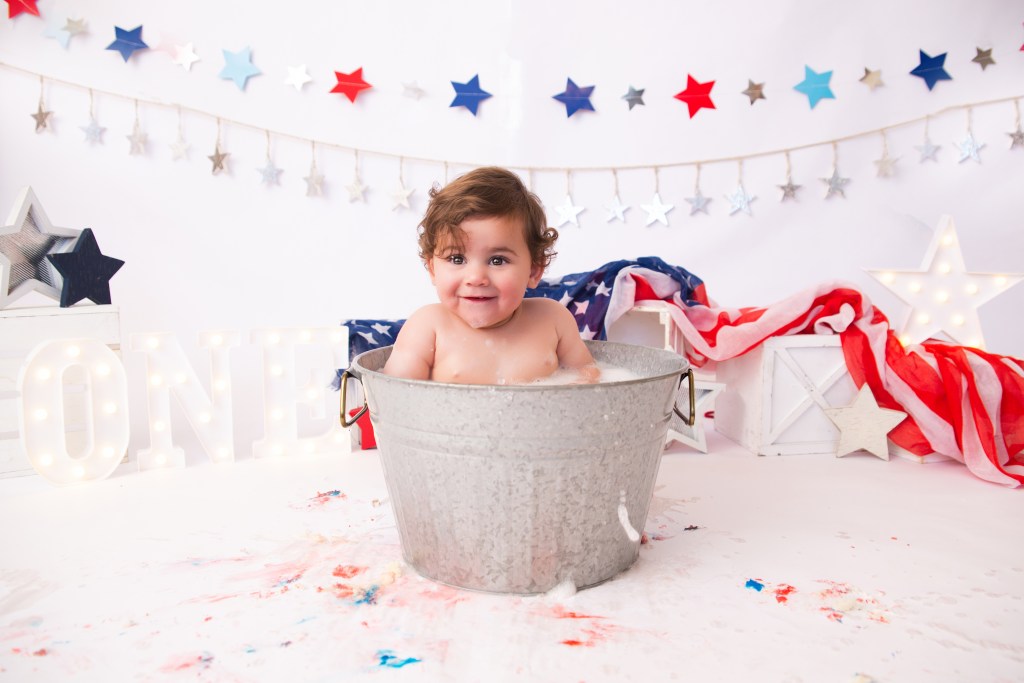 After all that cake smashing and celebrating, this little firecracker wrapped up her session with the cutest patriotic milk bath! She splashed, giggled, and soaked in the bubbly fun while still surrounded by stars and stripes. That sweet little grin and those bubbly toes say it all—she loved every second of it! These tub shots are the perfect way to end a cake smash session, and they always bring out those pure, joyful expressions we all want to remember forever.
